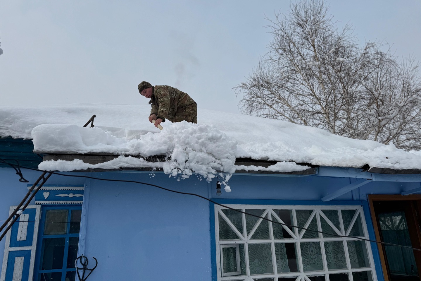 Әскерилер ардагердің ауласын қардан тазартып, үй шатырының үстінде жиналған қарды да толықтай тазалап шықты.