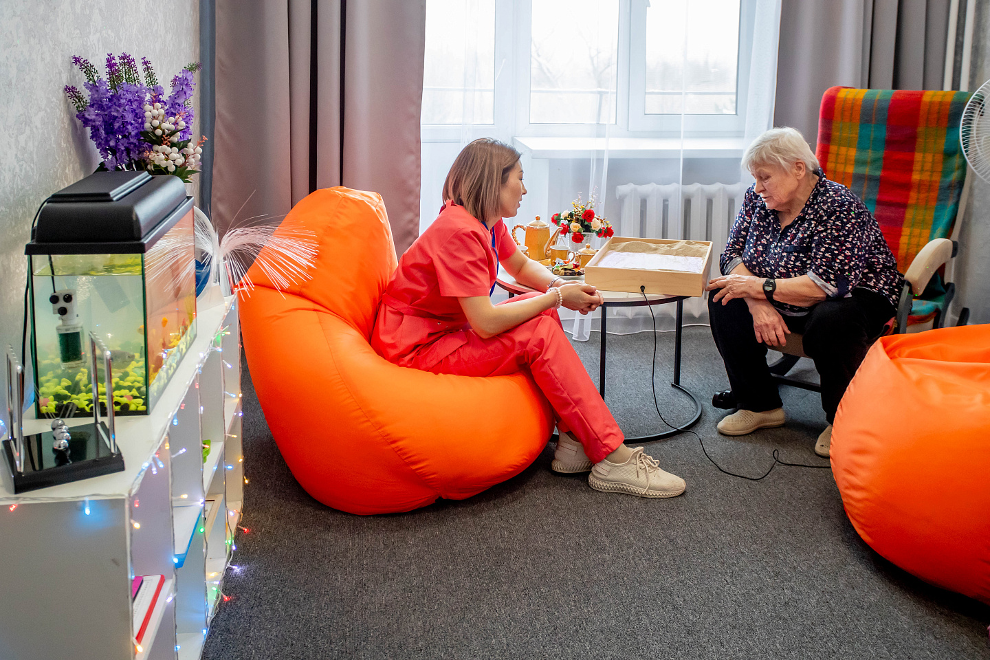 В кабинете психологической разгрузки двое постояльцев. Пока пожилой мужчина сидит на массажном кресле, женщина разговаривает со специалистом, рисуя замысловатые узоры специальным песком.
