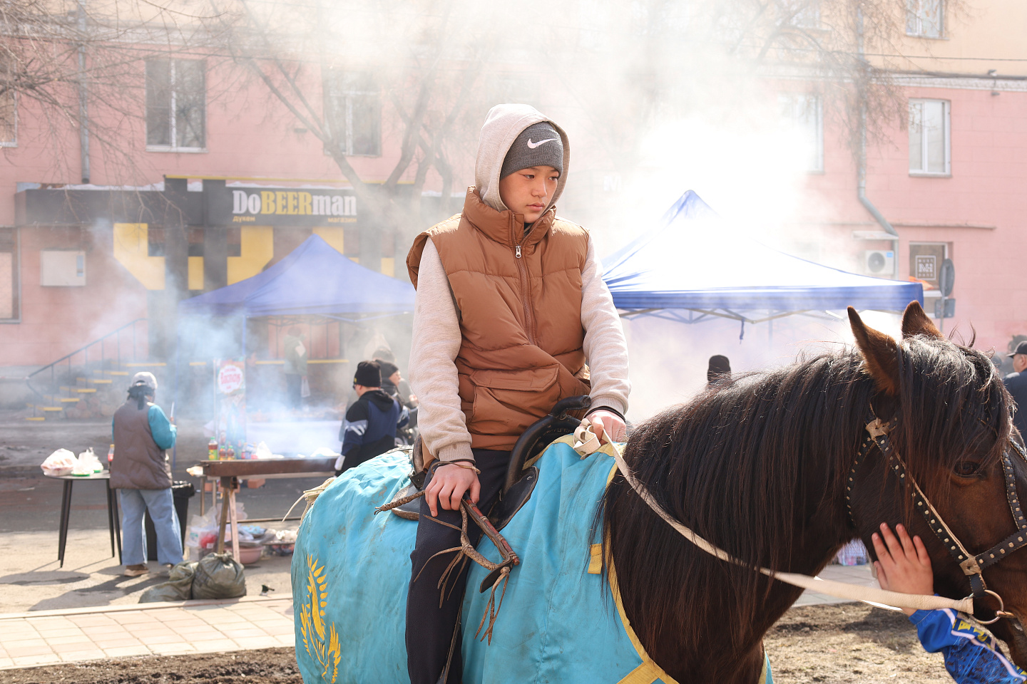 Очень весело и познавательно прошел и мастер-класс по приготовлению традиционных баурсаков – символов весеннего солнца. Все желающие готовили их прямо на улице под руководством опытных мастериц. А дальше участники под бурные овации болельщиков смогли продемонстрировать свое умение поедать пять сдобных колобков на время, да еще и без помощи рук. Выигрывал тот, кто быстрее всего справлялся с нелегкой задачей.